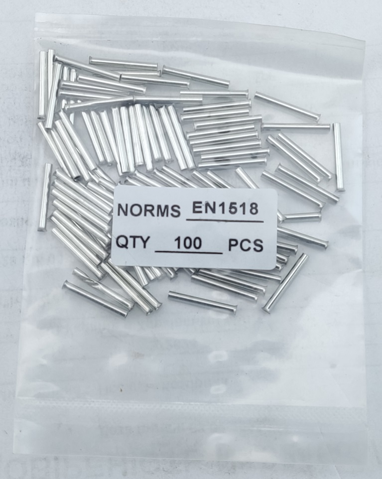 Наконечник гільза без ізоляції EN1518 призначений для оконцювання шляхом опресування попередньо зачищених від ізоляції багатодротяних мідних проводів та кабелів перетином 1,5 мм².