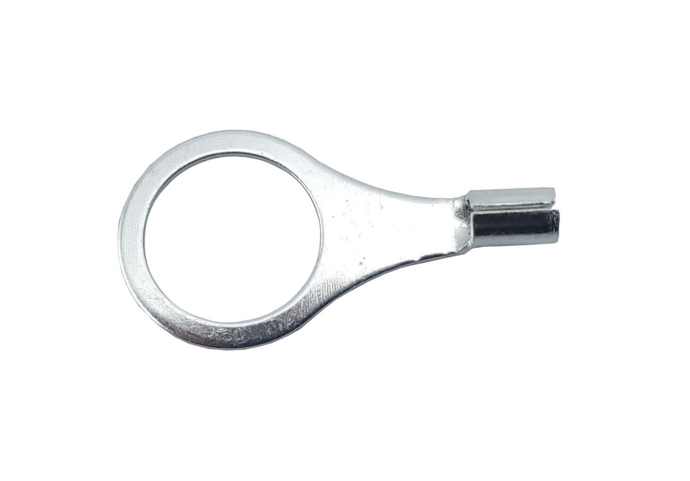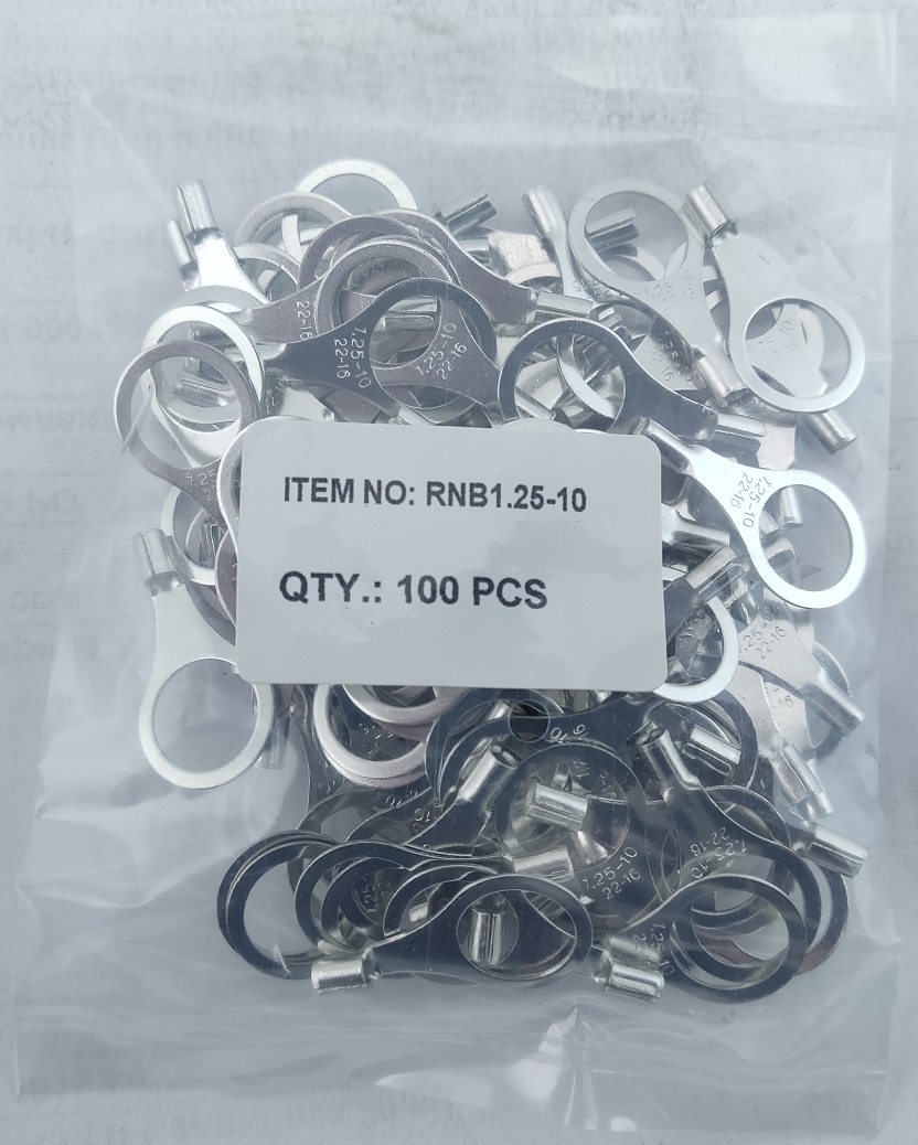 Наконечник кільцевий без ізоляції RNB1,25-10 (0,5-1,5/10) призначений для оконцювання шляхом опресування попередньо зачищених від ізоляції багатодротяних мідних проводів та кабелів перетином 0,5 — 1,5 мм², і приєднання їх  до пристроїв що мають контактні групи з болтами (гвинтами).