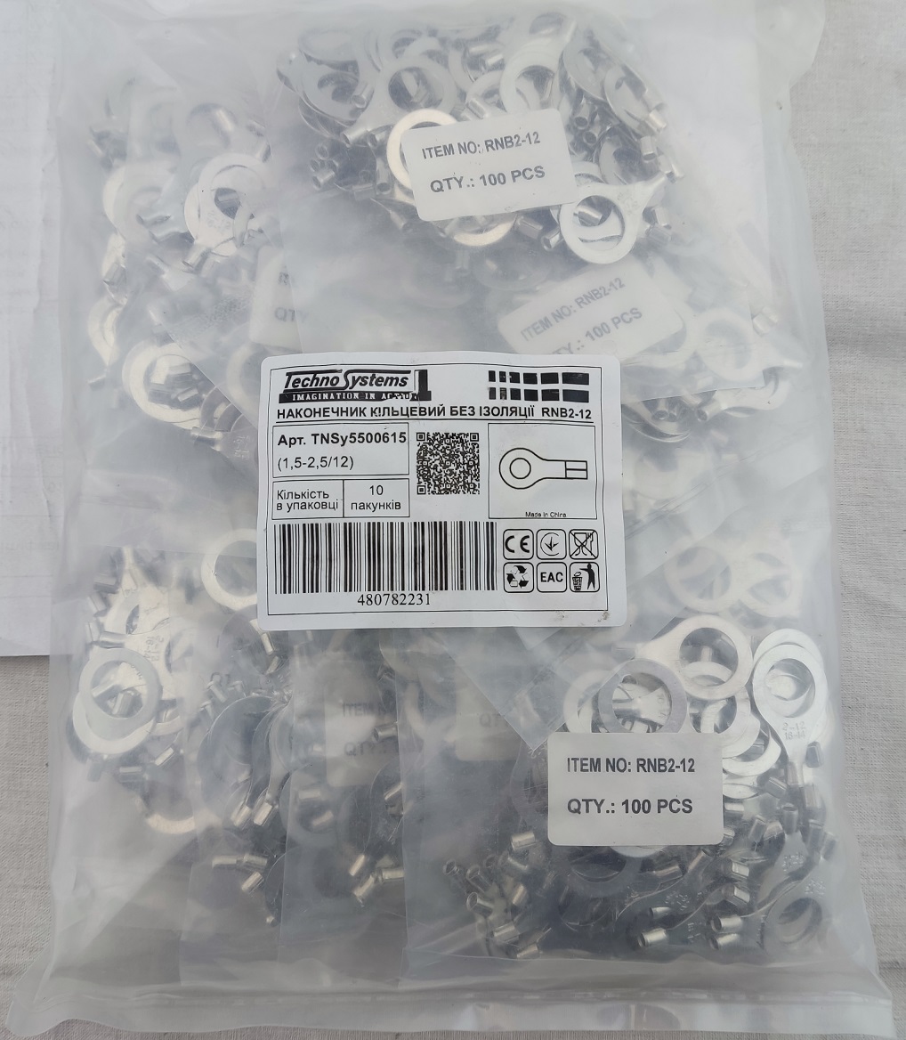 Наконечник кільцевий без ізоляції RNB2-12 (1,5-2,5/12) призначений для оконцювання шляхом опресування попередньо зачищених від ізоляції багатодротяних мідних проводів та кабелів перетином 1,5 — 2,5 мм², і приєднання їх  до пристроїв що мають контактні групи з болтами (гвинтами).
