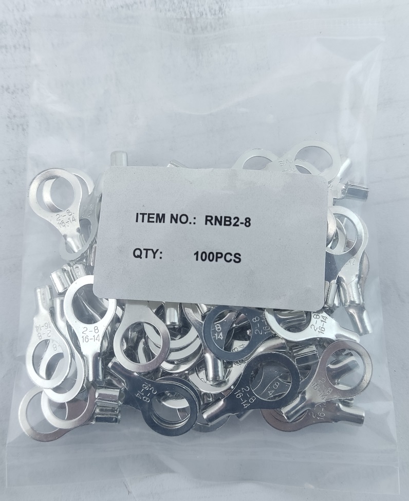 Наконечник кільцевий без ізоляції RNB2-8 (1,5-2,5/8) призначений для оконцювання шляхом опресування попередньо зачищених від ізоляції багатодротяних мідних проводів та кабелів перетином 1,5 — 2,5 мм², і приєднання їх  до пристроїв що мають контактні групи з болтами (гвинтами).