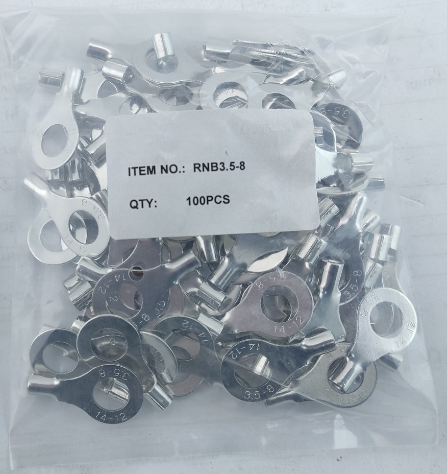 Наконечник кільцевий без ізоляції RNB3,5-8 (2,5-4/8) призначений для оконцювання шляхом опресування попередньо зачищених від ізоляції багатодротяних мідних проводів та кабелів перетином 2,5 — 4,0 мм², і приєднання їх  до пристроїв що мають контактні групи з болтами (гвинтами).