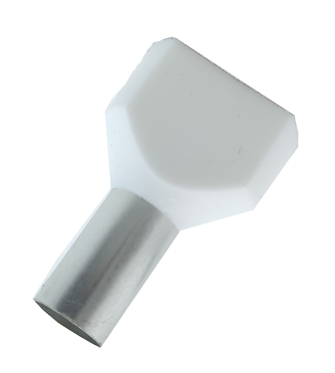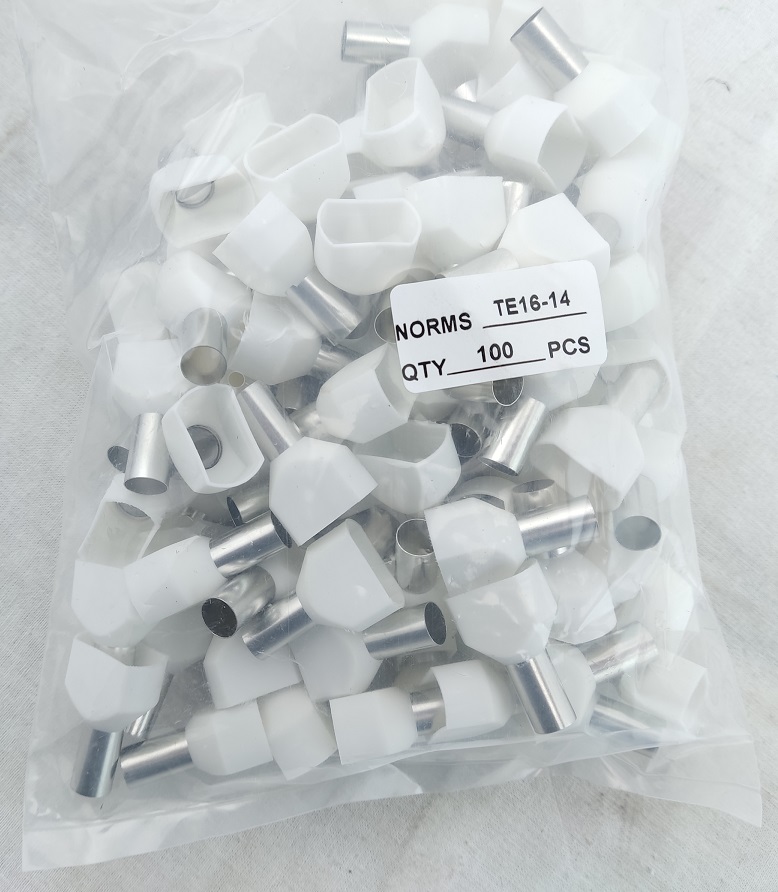 Наконечник гільза для 2х проводів TE16-14 білий — призначений для окінцювання проводів і підключення їх до контактних затискачів різного електроустаткування наприклад до клемних блоків, набірних затискачів, розеток, автоматичних вимикачів. Даний тип наконечників призначений для окінцювання багатодротяних гнучких проводів. Цей наконечник виконує ті самі функції як і наконечник гільза E, але дає можливість оконцювання не одного дроту, а двох.