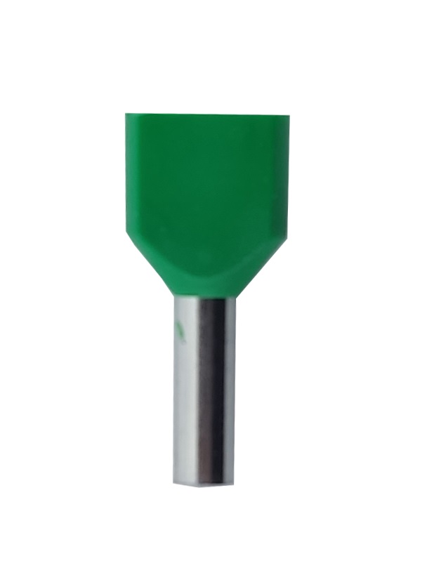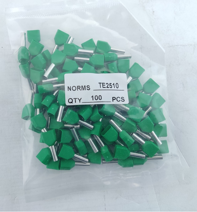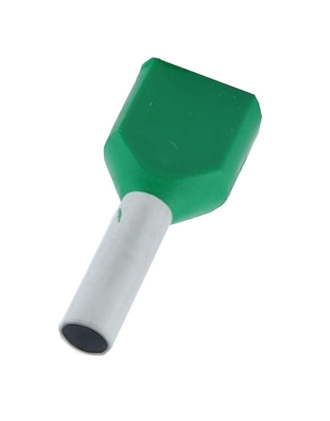 Наконечник гільза для 2х проводів TE2510 зелений — призначений для окінцювання проводів і підключення їх до контактних затискачів різного електроустаткування наприклад до клемних блоків, набірних затискачів, розеток, автоматичних вимикачів. Даний тип наконечників призначений для окінцювання багатодротяних гнучких проводів. Цей наконечник виконує ті самі функції як і наконечник гільза E, але дає можливість оконцювання не одного дроту, а двох.