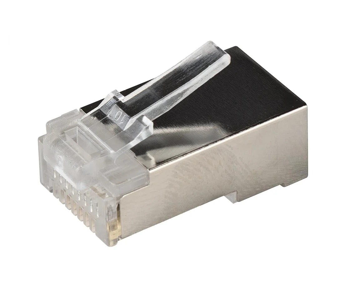 Роз’єм RJ458P8C (А) FTP для кабелю кат.5Е — це стандартний інтерфейс для підключення мережевого обладнання. Конектор має 8 посадкових місць і 8 золочених контактів.