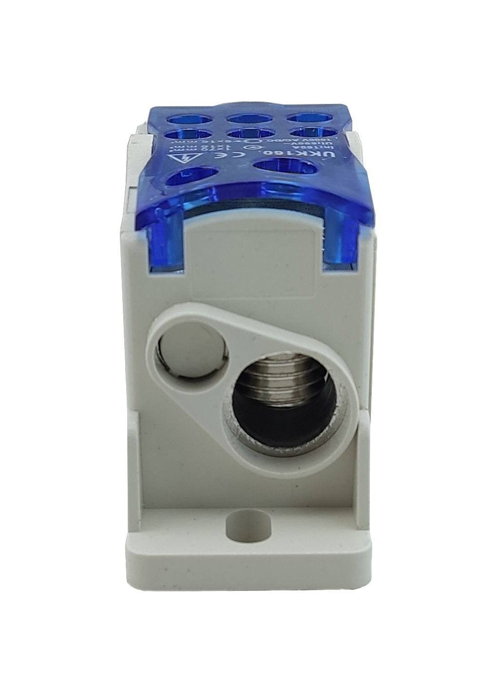 Розподільний блок на DIN-рейку РБД-160А — призначений для використання в якості клемного затиску при підключенні до провідника більшого перерізу кількох провідників меншого перерізу, з метою створення впорядкованої системи розподілу в шафах, для організації головної заземлюючої шини.