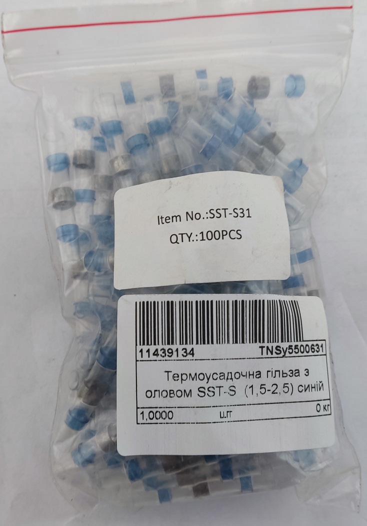 Термоусадочна гільза з оловом SST-S (1,5-2,5) — використовується для з’єднання мідних проводів паянням.
