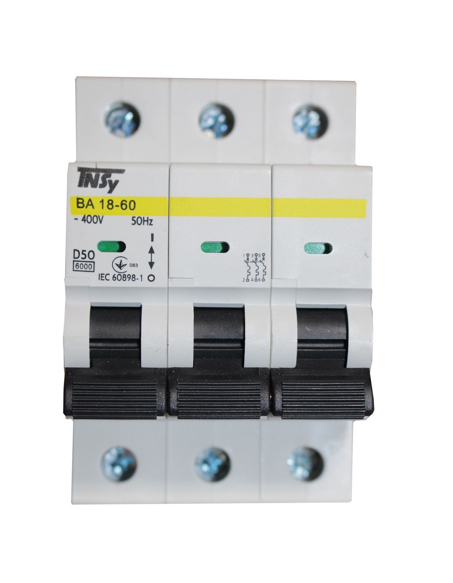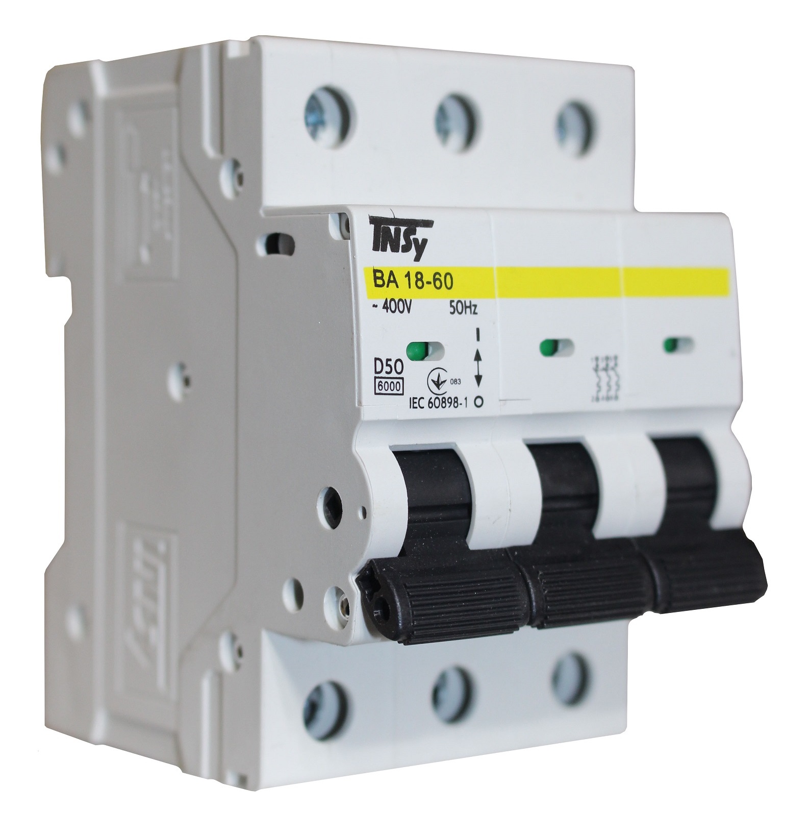 Автоматичний вимикач ВА18-60 3Р 50А 6кА х-ка D — призначений для експлуатації в однофазних або трифазних електричних мережах змінного струму з номінальною напругою не більше 400 В, частотою 50 Гц. Виріб відповідає Технічним регламентам низьковольтного електричного обладнання та електромагнітної сумісності обладнання в частині, ДСТУ EN 60947-1, ДСТУ EN 60947-2, ДСТУ EN 60898-1, ДСТУ EN 61000-3-3, ДСТУ EN 61000-3-2, а також сертифікований на території України.