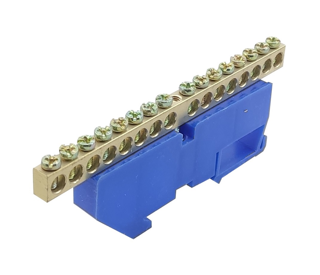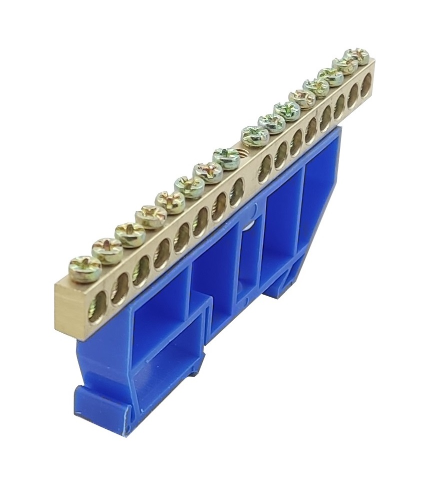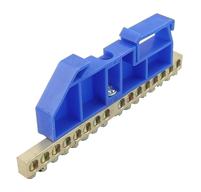 Шина ізольована «N» на DIN-рейку ШЛІ6х9-16 синій — призначається для електричного та механічного з’єднання нульових, захисних та фазних провідників.