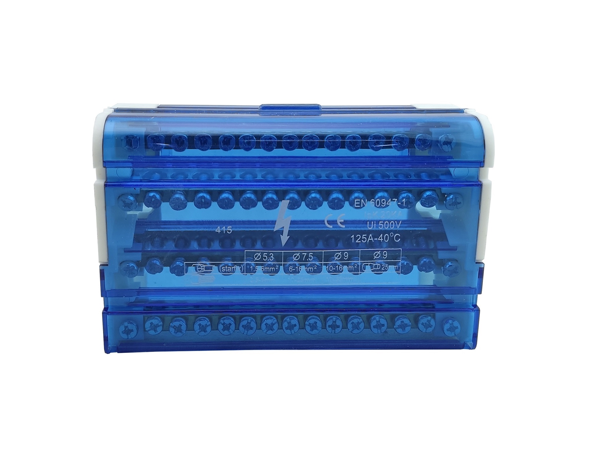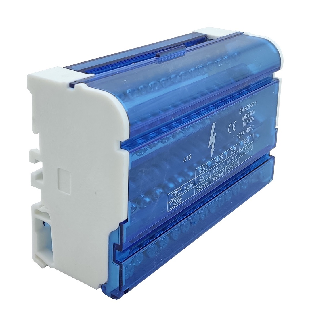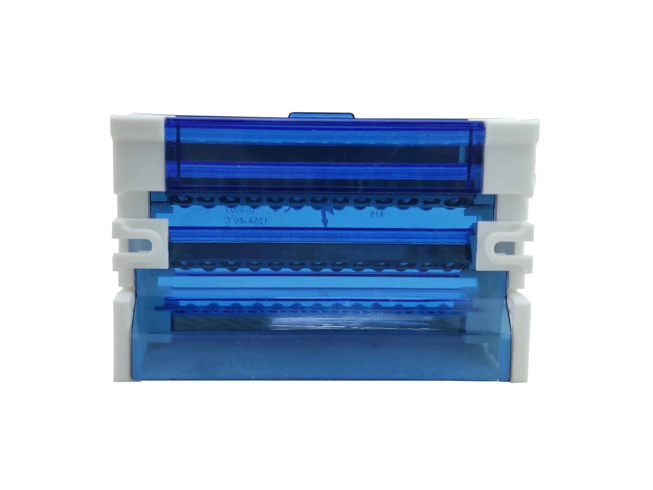 Шина «N» на DIN-рейку в корпусі ШНК4х15 синій — виконана з високоякісної латуні, ізолююча задня панель і прозора задня кришка виконані з пластику, що самозагасає.