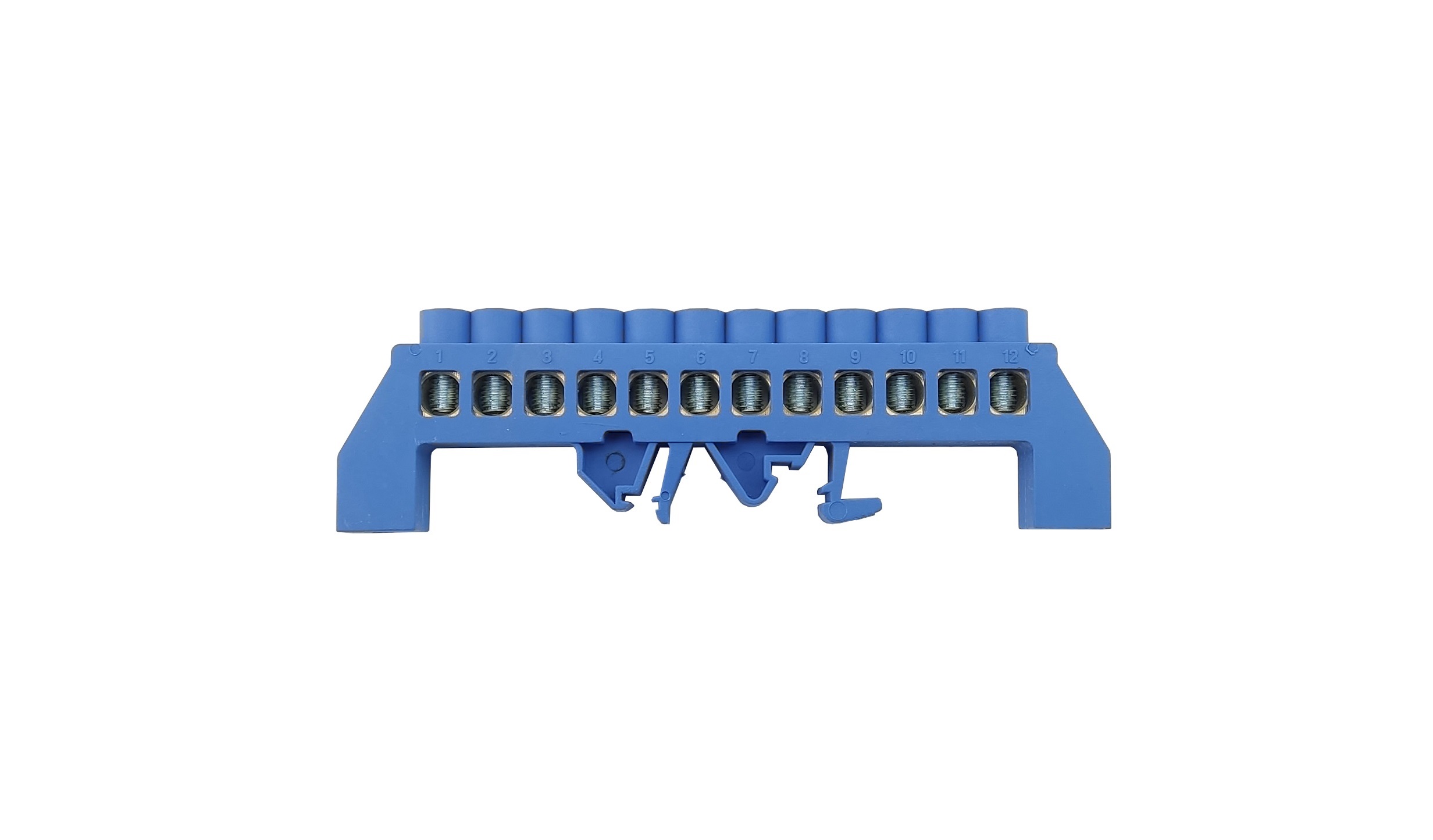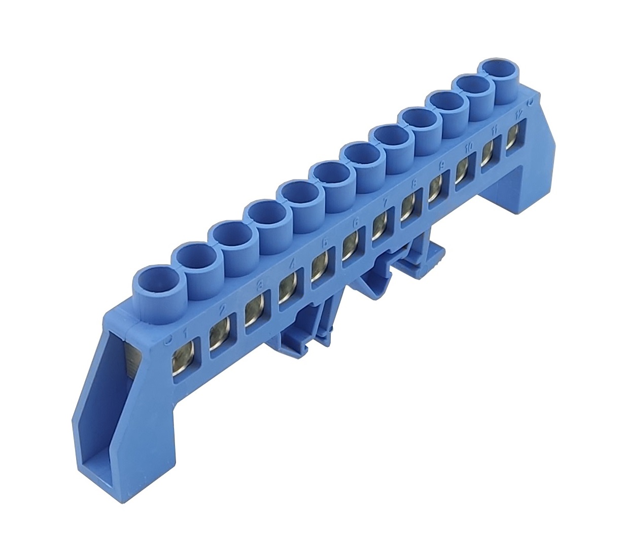 Шина універсальна ізольована «N» на DIN-рейку ШЛУ8х12-12 синій — призначається для електричного та механічного з’єднання нульових, захисних та фазних провідників.