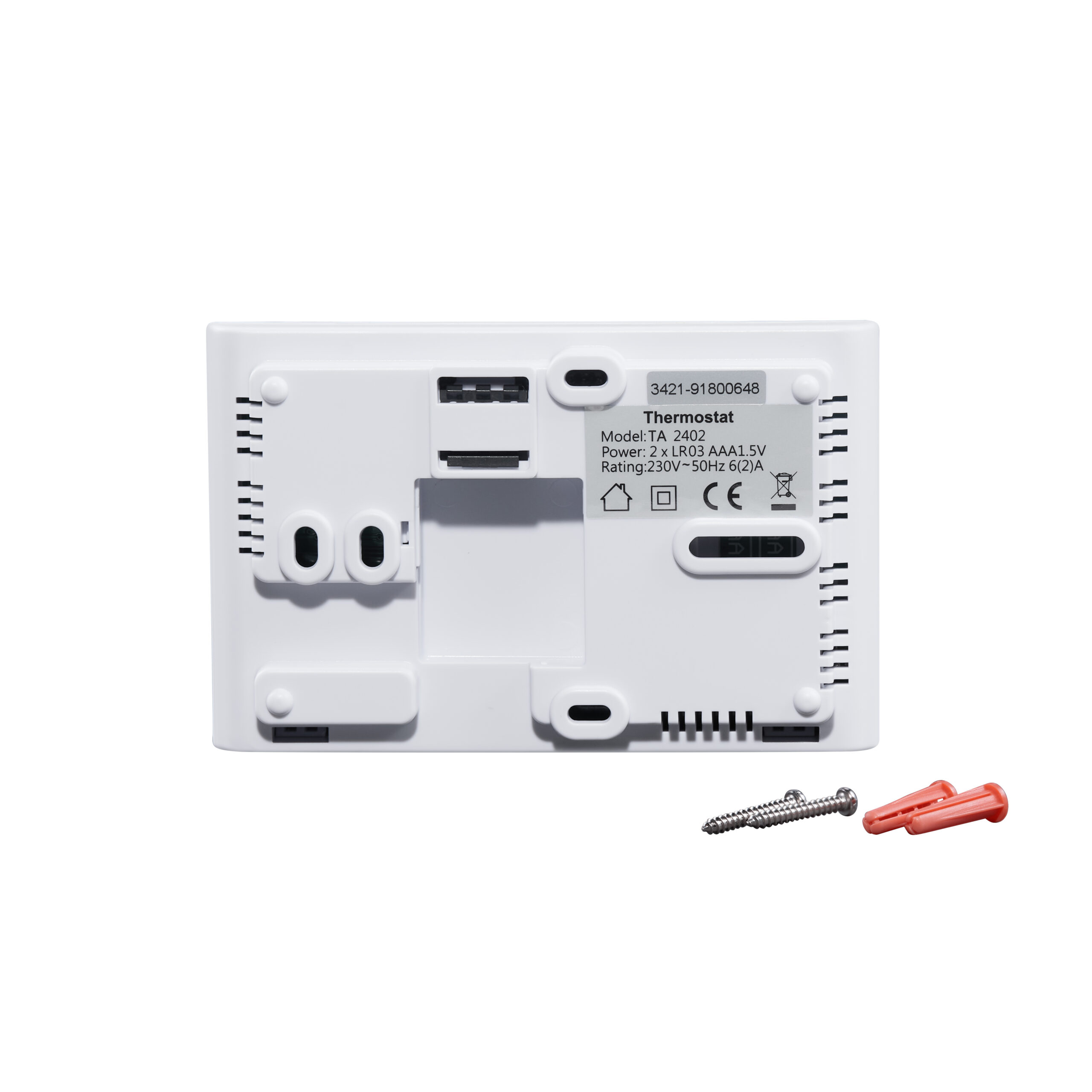 Тижневий програмований термостат Thermo Alliance ТА-2402 підключається до котла за допомогою кабелю та керує процесами увімкнення/вимкнення опалювального приладу за "Сухим Каналом". Блок кімнатного термостата використовується як графічний інтерфейс користувача для визначення та контролю температури в приміщенні. Оскільки відстань від кімнатного термостата до котла в різних приміщеннях відрізнятиметься, кабель підключення не входить до комплекту постачання продукції.