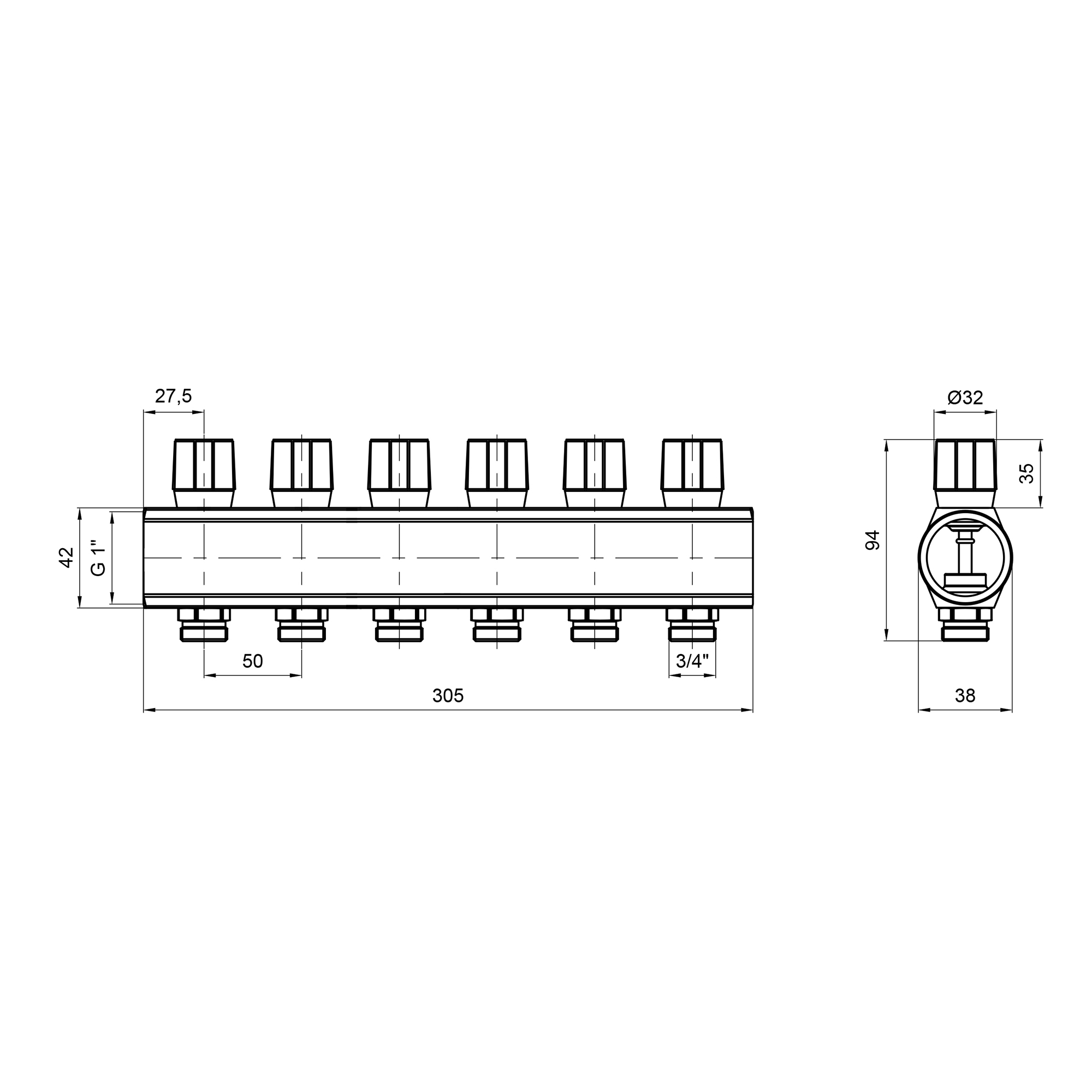 Колектор Icma з регулювальними вентилями 1" 6 виходів №1105 (Blue) призначений для розподілу потоку в системах гарячого та холодного водопостачання. Колектор з ручками управління синього кольору.