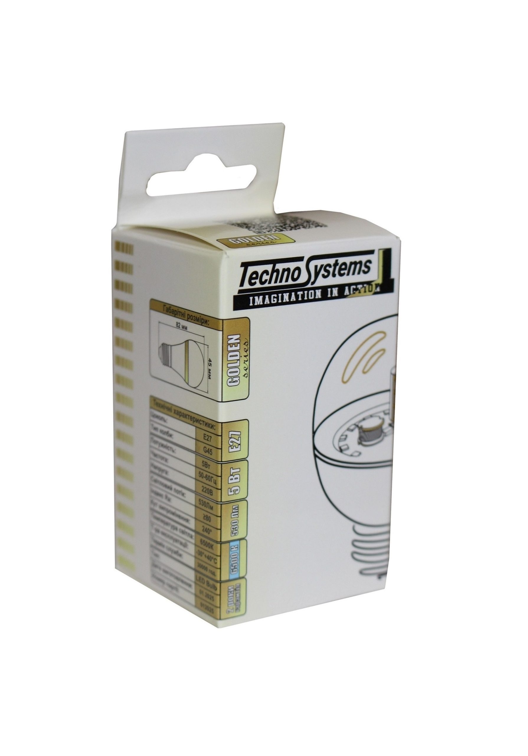 Лампа світлодіодна LED Bulb-G45-5W-E27-220V-6500K-530L GOLDEN використовується для освітлення житлових, громадських, технічних приміщень. Лампа відповідає вимогам Технічного регламенту з електромагнітної сумісності обладнання, Технічному регламенту безпеки низьковольтного електричного обладнання (Декларація про відповідність виробника) ДСТУ EN 55015:2017 п. 4.3.1, ДСТУ EN 61547: 2016 п. 5.2, ДСТУ EN 61000-3-2:2016, ДСТУ EN 61000-3-3:2017 р. 5, ДСТУ EN 62560:2016 р. 5, 8, 10, ДСТУ EN 13032-4:2017 рр. 4-8. Ступінь захисту від впливу зовнішнього середовища IP20. Комплект поставки: Упаковка, лампа, паспорт Склад виробу: Лампа складається з пластикового розсіювача, драйвера, світлодіодного модуля, корпусу та металевого цоколя. Не містить шкідливих речовин.