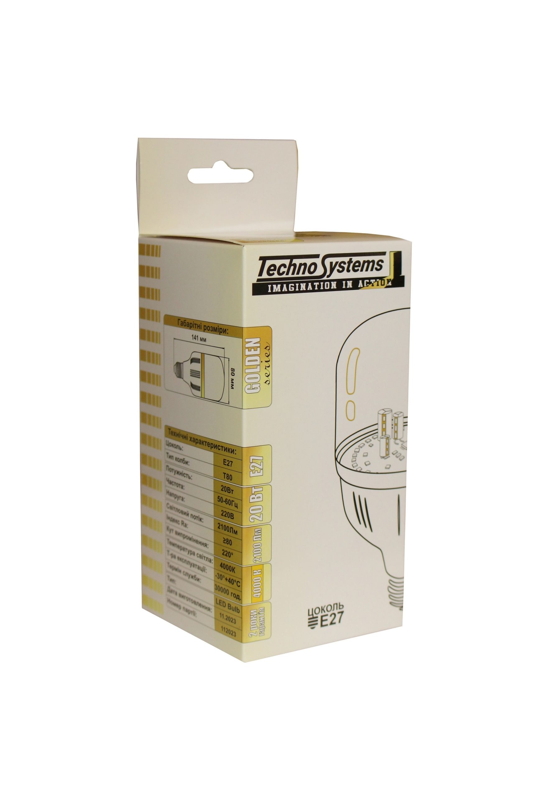 Лампа світлодіодна LED Bulb-T80-20W-E27-220V-4000K-2100L GOLDEN використовується для освітлення житлових, громадських, технічних приміщень.