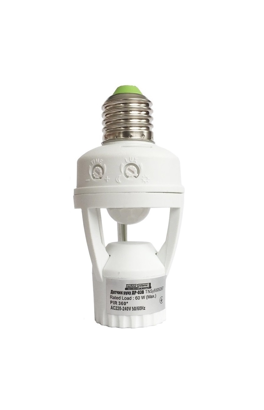 Датчик руху ДР 03B білий Е27 60Вт. 360гр. 7м. IP20 — призначений для експлуатації в однофазних електричних мережах змінного струму напругою 230 В частотою 50 Гц.