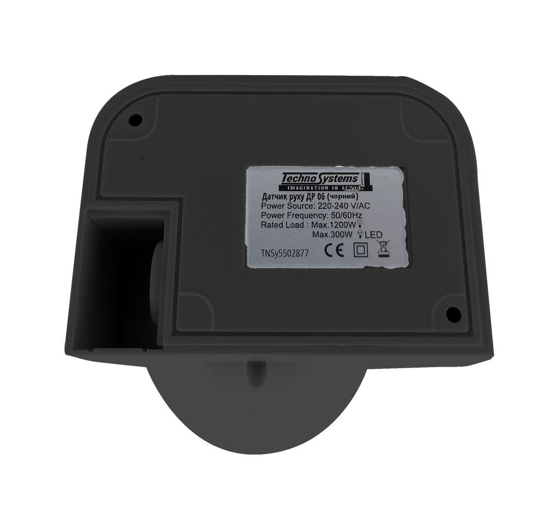Датчик руху ДР 06 чорний 1200Вт 180град 12м. IP44 — призначений для експлуатації в однофазних електричних мережах змінного струму напругою 230 В частотою 50 Гц.